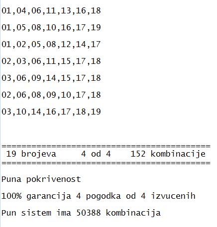 Скраћени лото систем, 19 бројева, гаранција 4 od 4, има 152 комбинације.